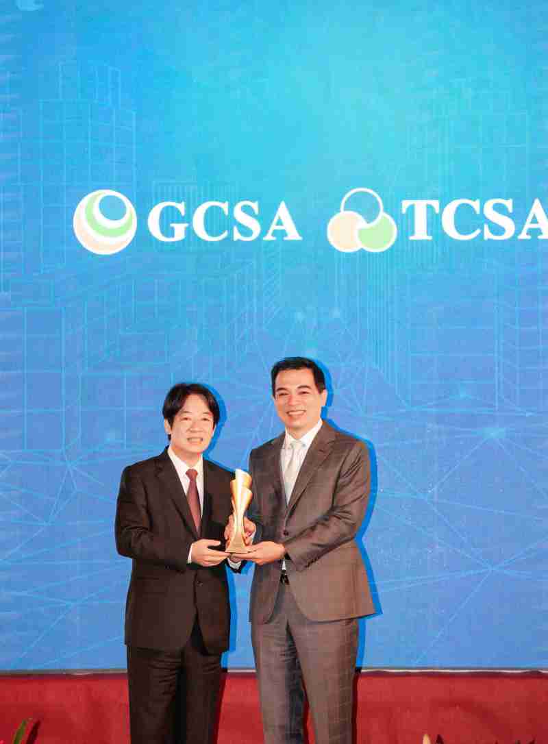 达全方位永续表现获全球永续奖及台湾永续奖肯定,,,,由副总统赖清德颁奖 (左),,,Wepay总经理柯富仁 (右) 代表领奖