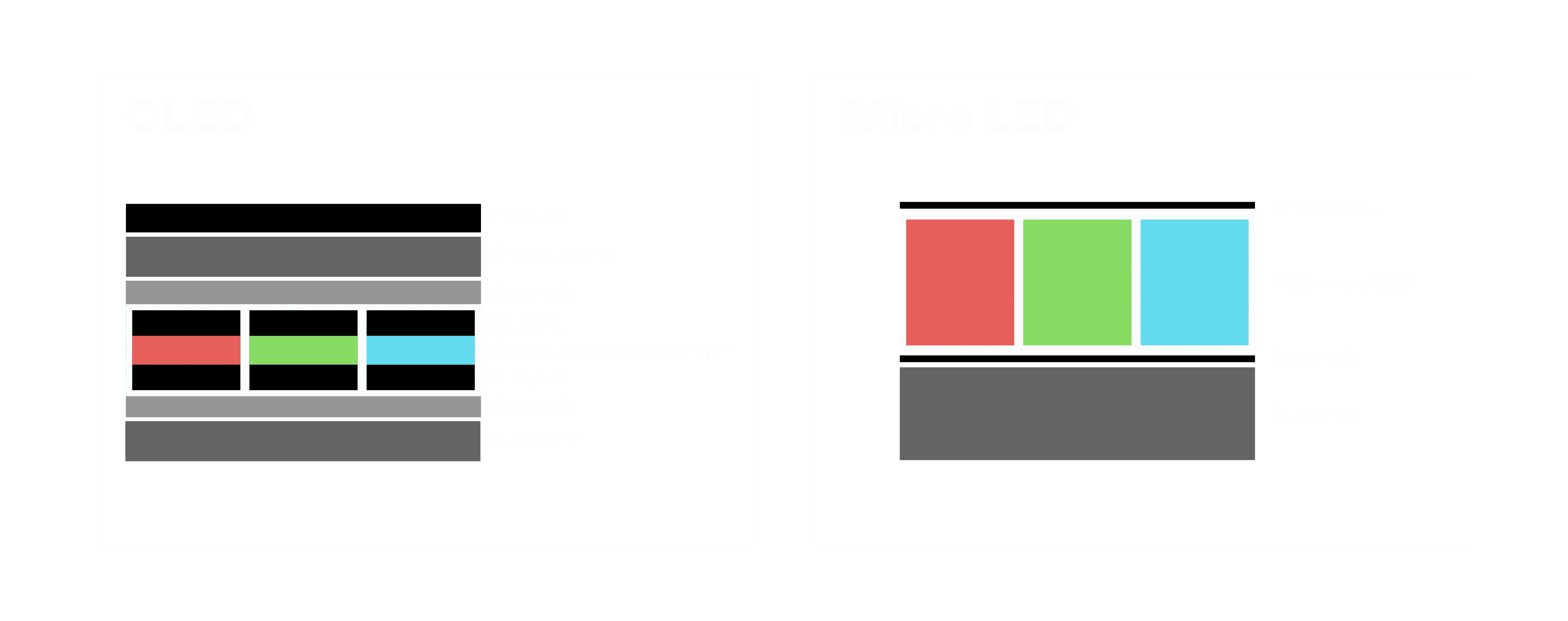 以 LED 做为显示画素,,可让 LED 的发光效率发挥到极致,,,,从而让显示器具备优异的亮度表现,,,,不论是在户外或室内,,,,均具备出众的显示效果。。。同时,,,,与使用有机材料的 OLED 相比,,,,LED 具备更稳定、、、寿命更长的特性,,,,不仅不会有画面烙印问题,,,而且更不容易出现故障、、、坏点。。。。